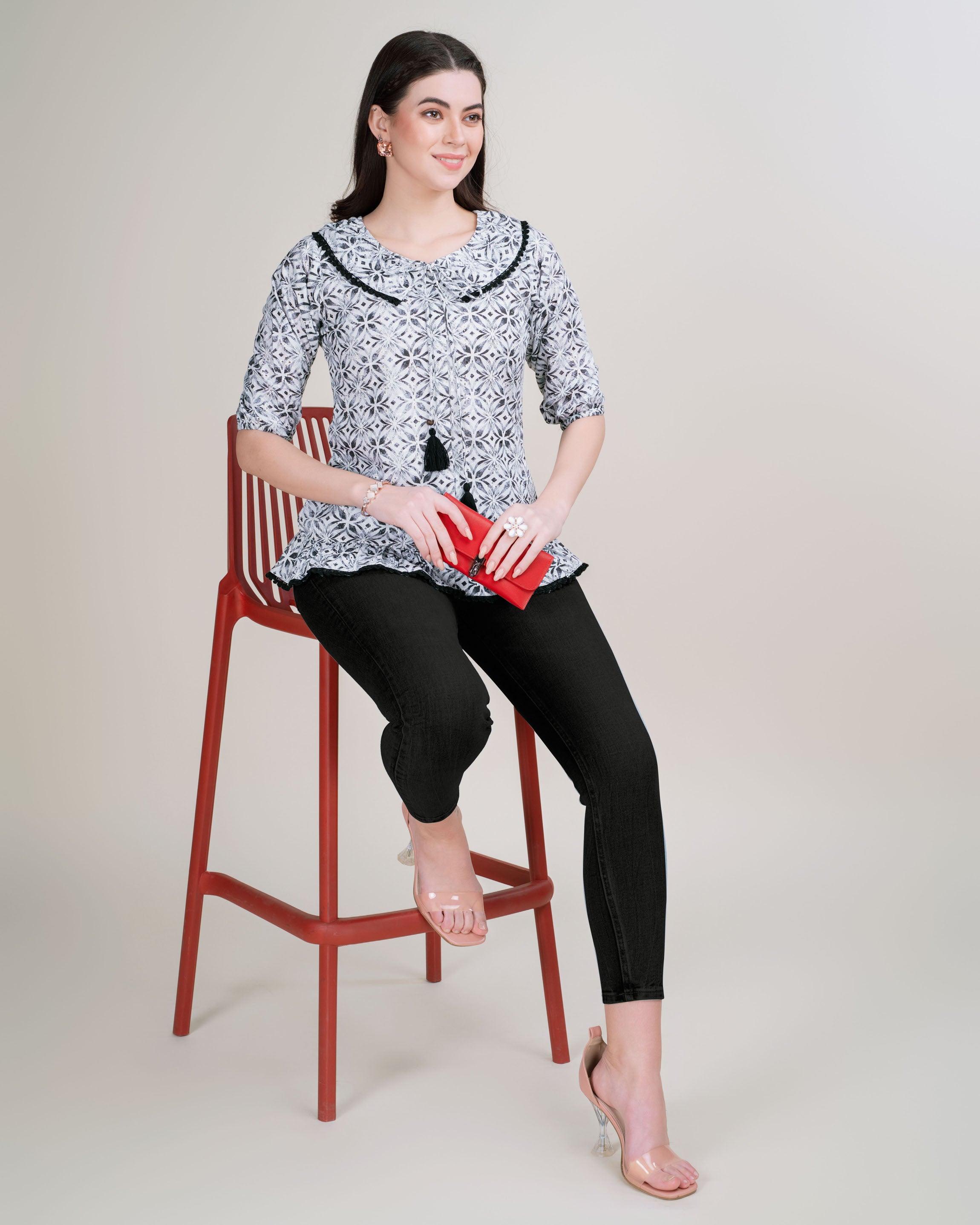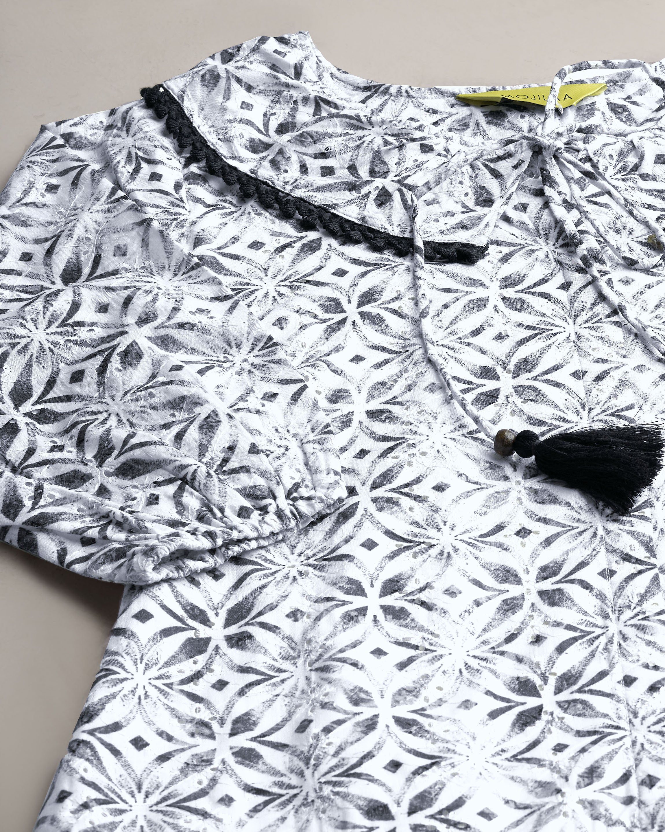Her Couture Women's Black Pure Cotton Blend Abstract Printed Bored Schiffli Embroidered Drop Waist Top