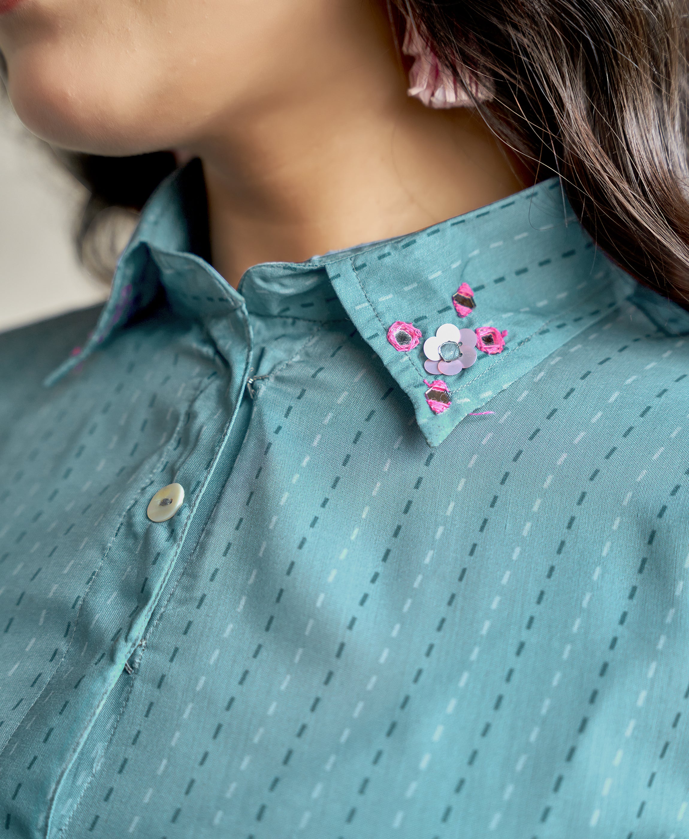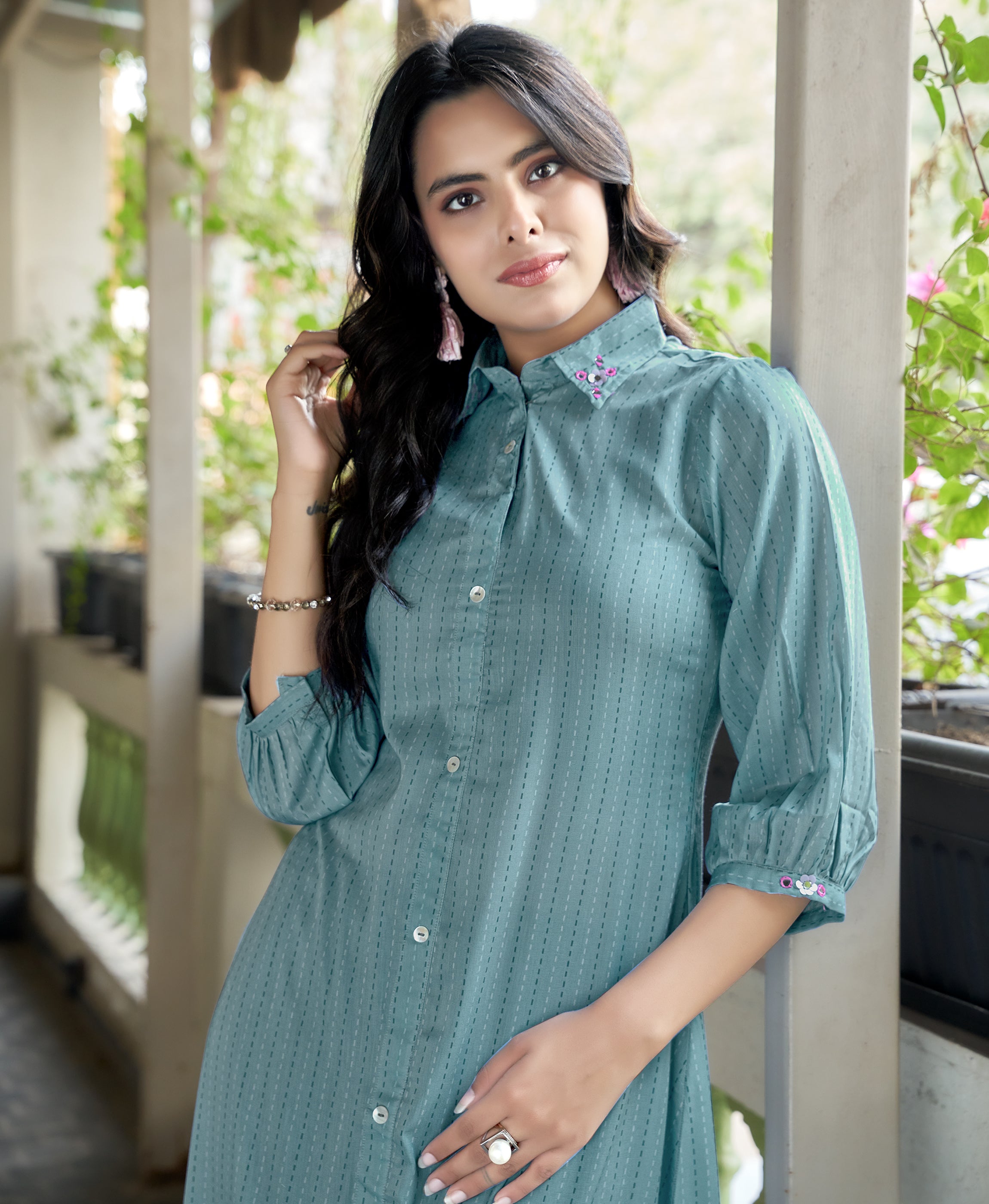 Her Couture Women's Blue Muslin Stripes Printed Flared Dress With Gathered or Pleated