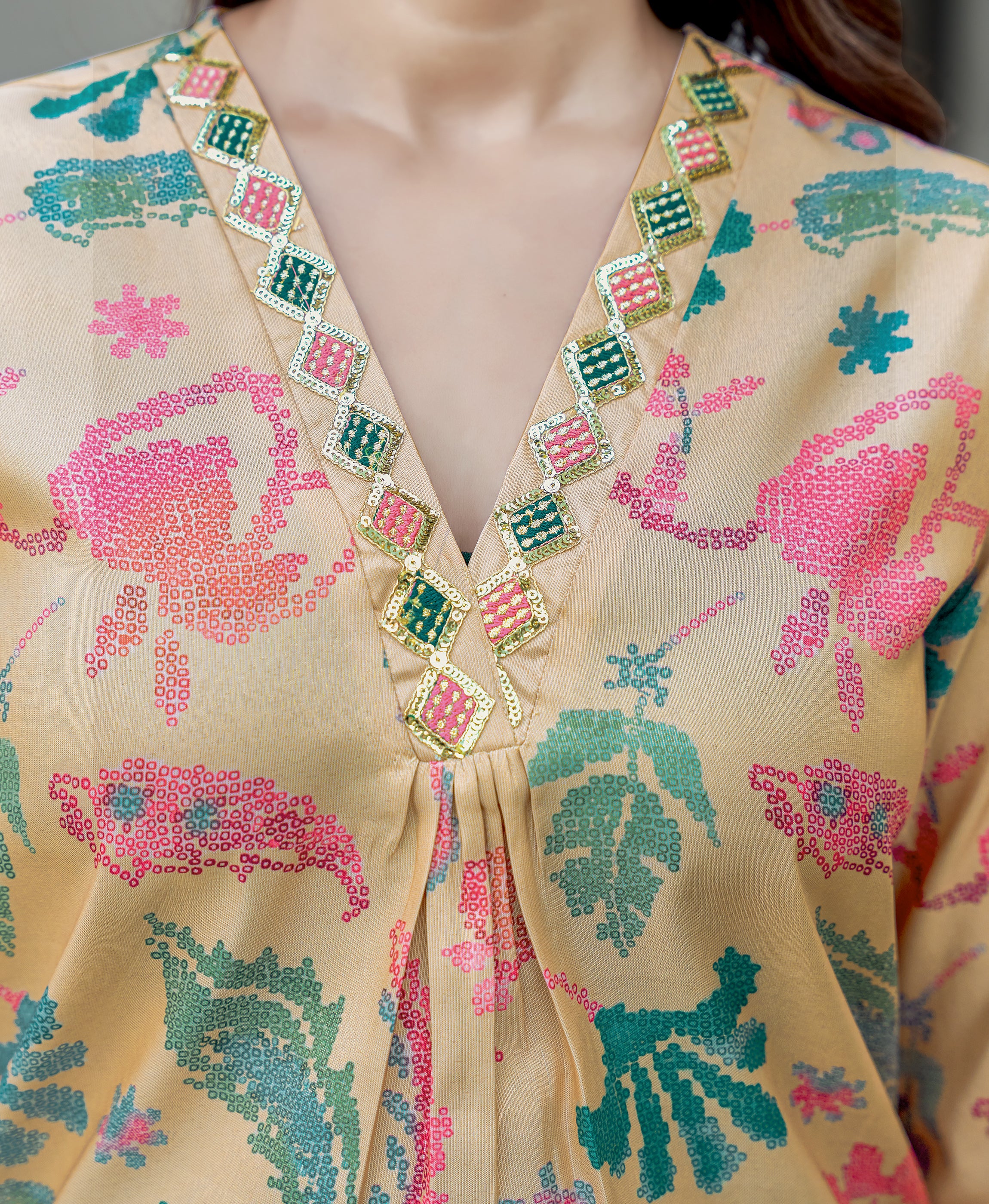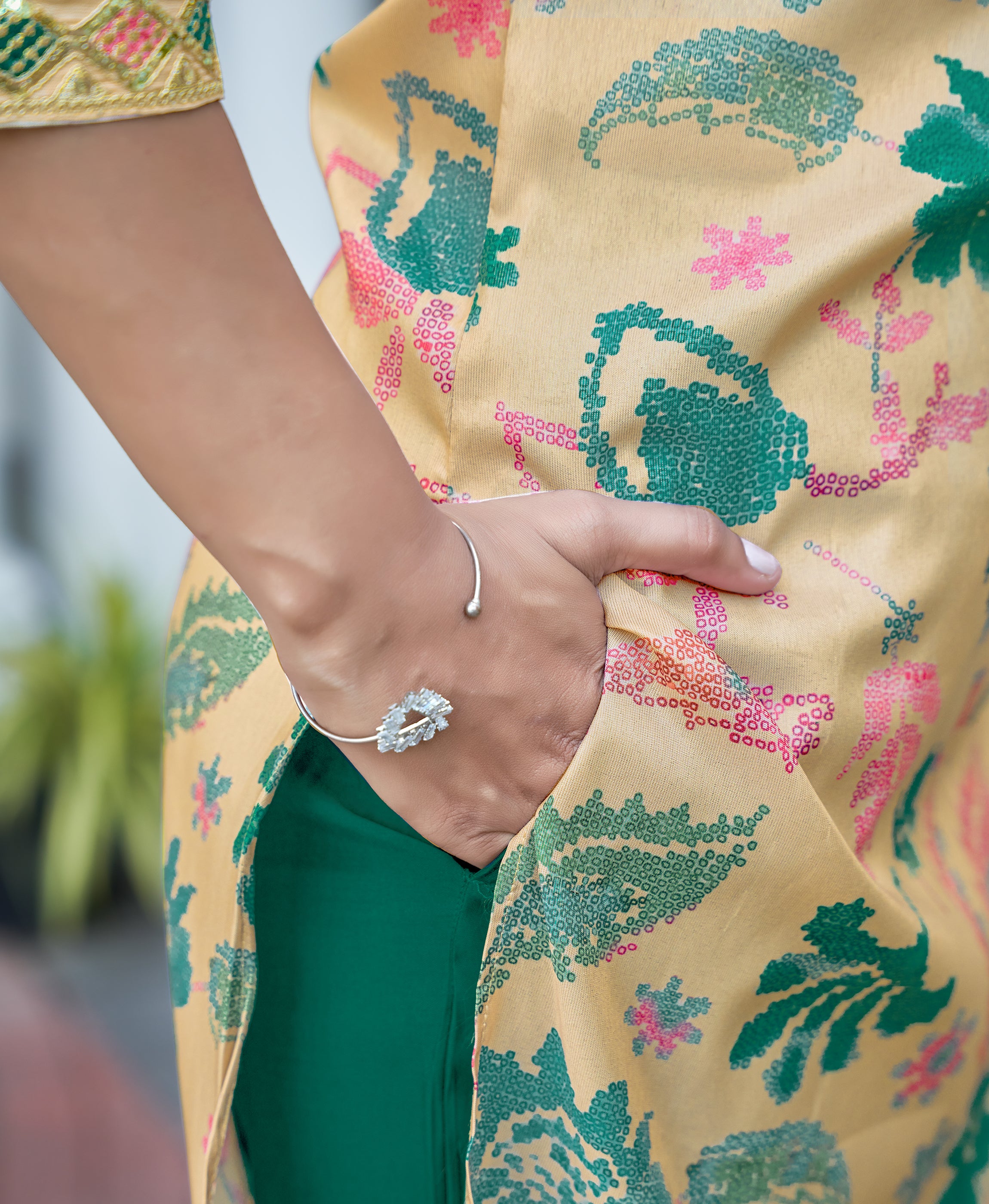 Her Couture Women's Cream Shimmer Silk Floral Printed Embroidered Straight Kurta With Pant