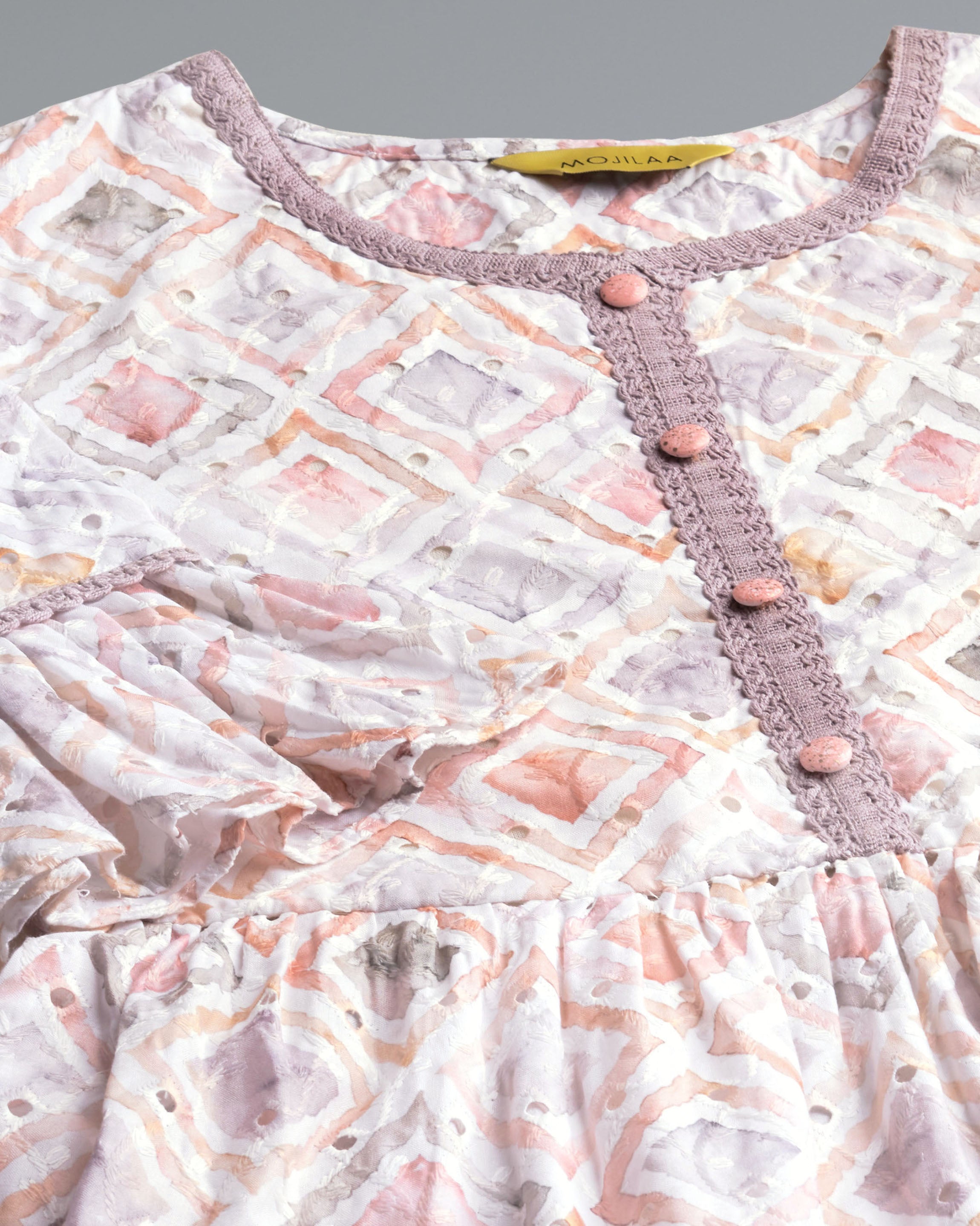 Her Couture Women's Mauve Pure Cotton Blend Abstract Printed Bored Schiffli Embroidered Peplum Top